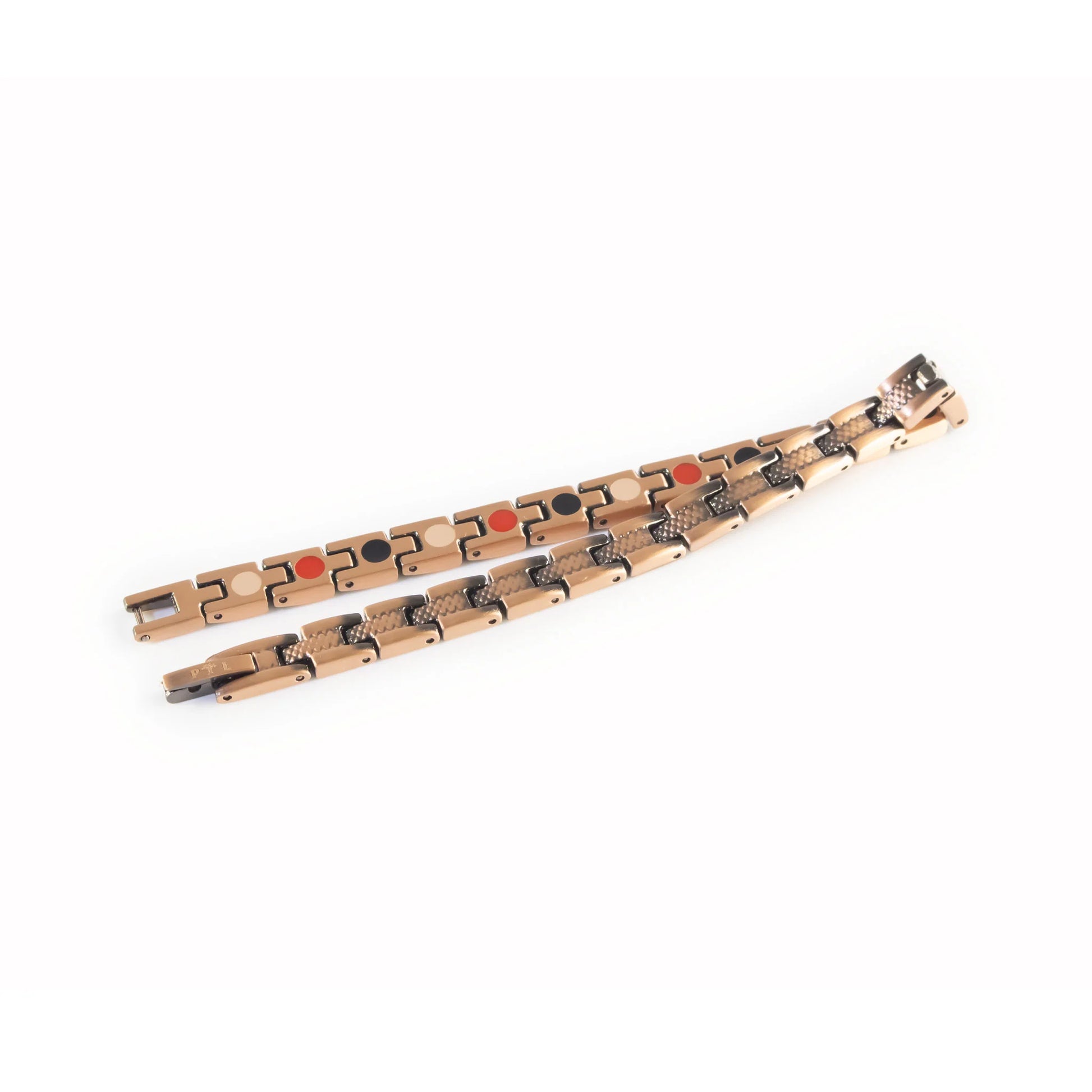 Alur Copper is a copper negative ion bracelet with bold style and refined texture. Its interlocking links are accented by a cross-hatched horizontal bar that circles the design for added depth. Inside, a single row of negative ions, germanium, and far infrared elements lends a touch of balance. With its polished finish and structured style, Alur Copper is a versatile bracelet that embodies strength and sophistication.
