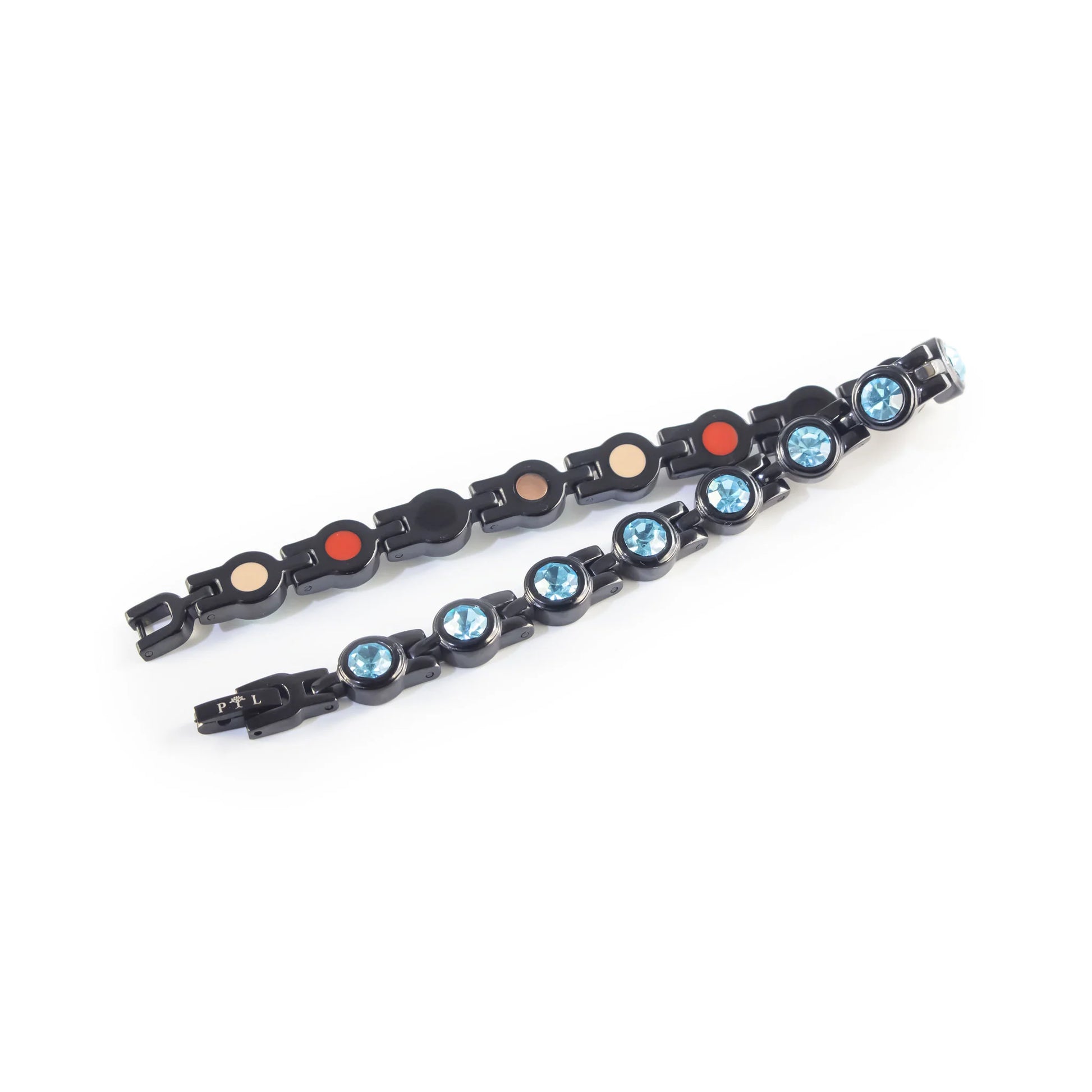 Stod Black & Aqua Crystals negative ion bracelet captures the brilliance of starlight with aqua crystals set in polished black stainless steel links. The design symbolizes guidance and clarity, making it a radiant accessory for any style. A hidden row of negative ion elements adds supportive balance and wellness, blending beauty and vitality.