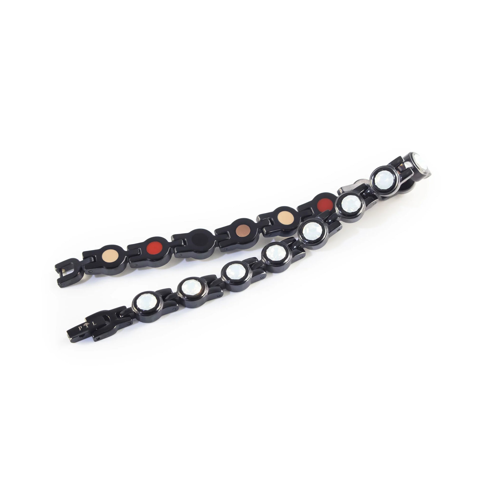 Stod Black & White Crystals shines with understated grace as white crystals gleam against polished black stainless steel. Feminine, refined, and timeless, it pairs inner strength with serene energy supported by negative ions.