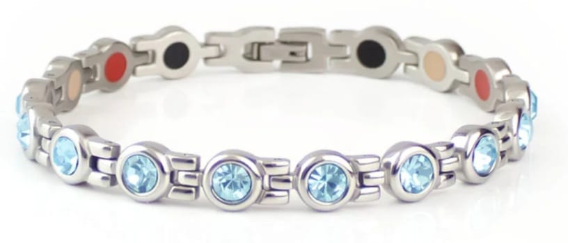 Stod Silver & Aqua Crystal- Negative Ion Bracelet, Stainless Steel with Aquamarine Swarovski