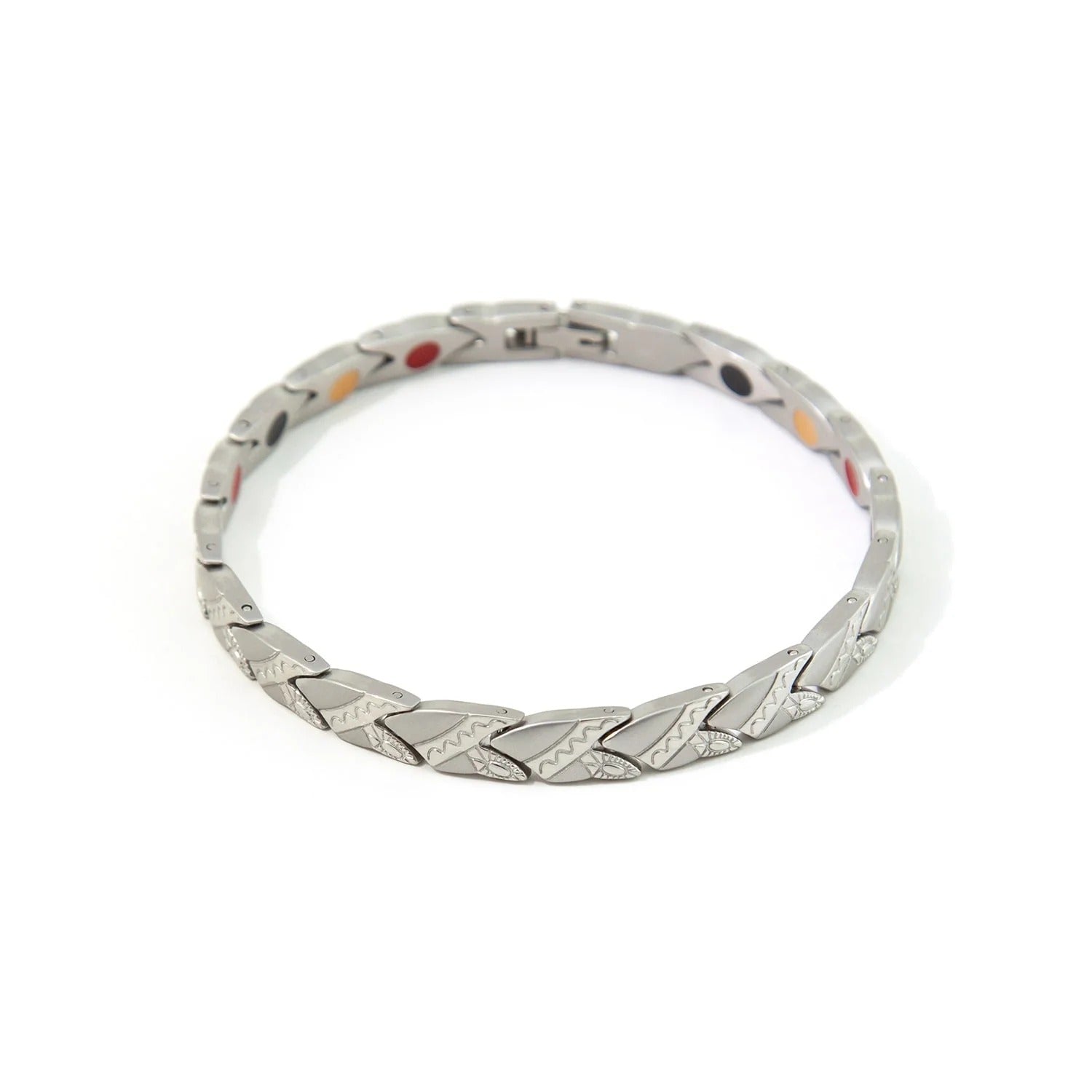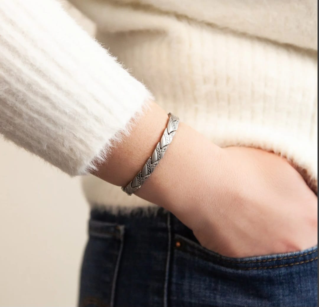 The Tulip Silver- Stainless Steel Negative Ion Bracelet - the perfect accessory for expressing uniqueness and style. This bold stainless-steel bracelet is a statement piece that adds edge to any outfit. Its sleek design features intricate detailing and curves that symbolize eternity, making it a timeless accessory with an elegant touch.