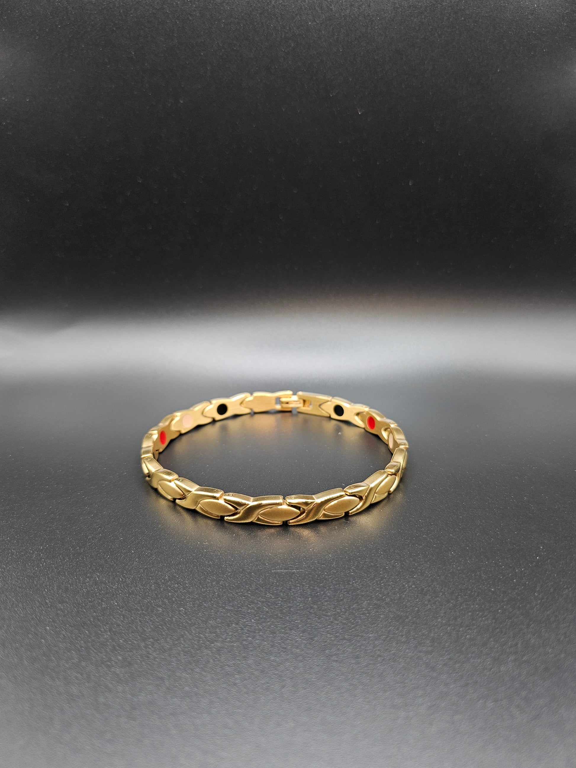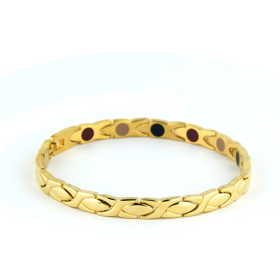 XO Gold - Negative Ion Bracelet is made from polished stainless steel and gold plated. This Bracelet is a great way to add style and zest to your everyday life.
